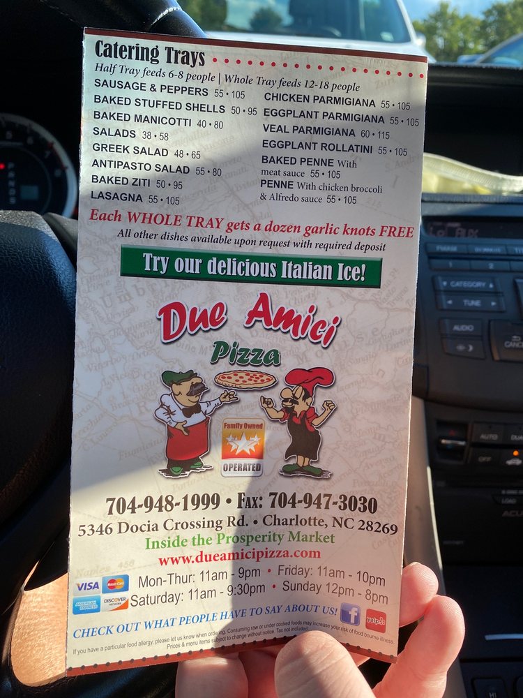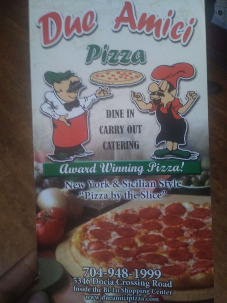 Introducing the menu at Due Amici Pizza is a culinary adventure worth embarking on. Located in Charlotte, NC, this pizza joint offers a variety of options including delicious NY style pizzas, flavorful pastas, and mouthwatering sandwiches. Customers rave about the Marinara sauce, tasty calamari, and authentic flavors that transport them to the streets of New York. With a diverse menu that caters to vegetarians and meat-lovers alike, Due Amici Pizza prides itself on providing a welcoming atmosphere with friendly staff and fast service. Be sure to try their popular Cheese pizza or NY Stromboli for a taste of traditional flavors. Whether you're craving a classic slice or a hearty pasta dish, Due Amici Pizza has something for everyone to enjoy.